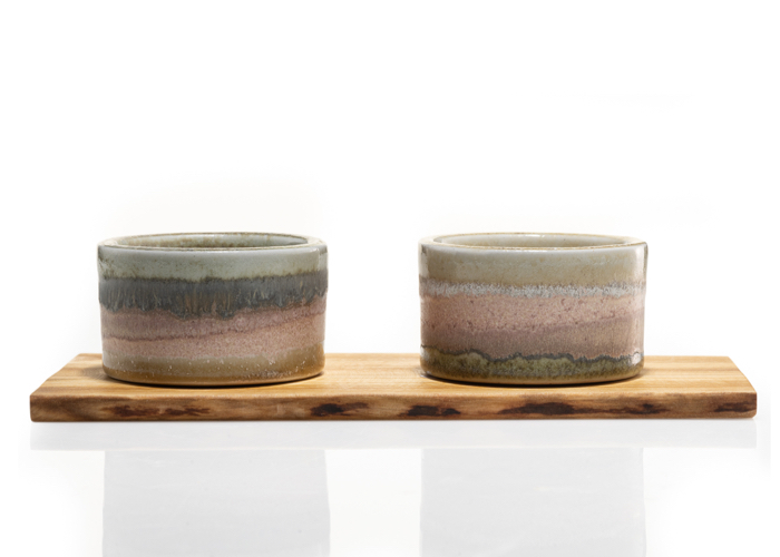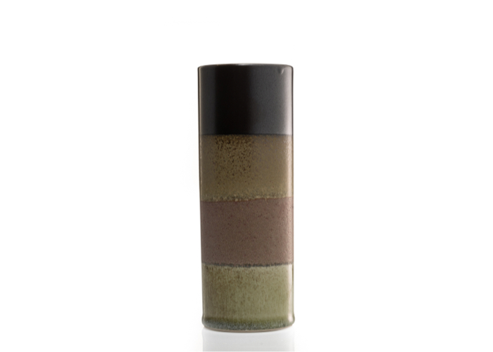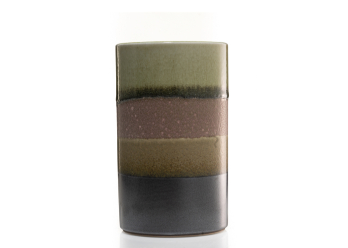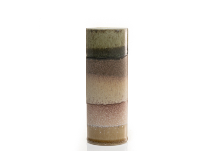 The many layers of glaze on the tight cylindrical shape provide texture, unpredictability and a unique play of colors on each product.